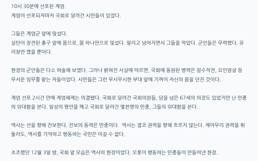 “밤새 취재하며 ‘상보’와 ‘종합’ 기사까지 마무리한 다음, 아침에는 르포 기사를 올리고 싶다. ‘기자 뽕’에 취했다고 한다면, 그럴 수도 있다. 그런데 기자라는 직함을 달고 있는 이상 그래야 할 것만 같다. 시민들을 넘어 계엄군에게도 질문을 던지고, 명함이라도 한 장 쥐여 줄 수 있는 기자가 되고 싶다.”