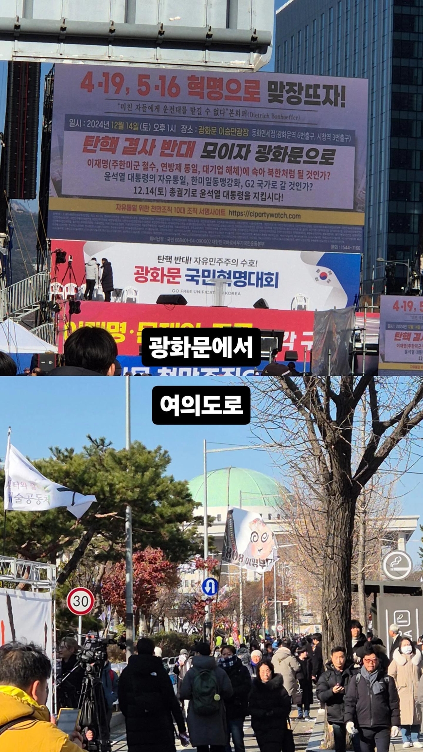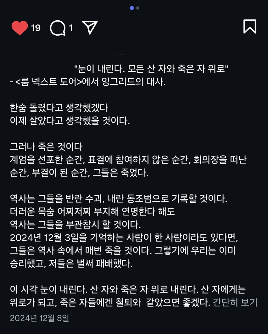 한강 둔치에 차를 대놓고는 ‘따릉이’를 타고 여의도로 향했다. 시끄럽고 정신없을 것 같던 국회 앞은 생각보다 조용하고 따듯했다. 사람들은 ‘계엄 철폐’를 외치면서도 서로 가져온 음식을 나눴다. 카메라는 그런 시민들을 비췄다. 국회 안에는 무장 군인이 들이닥쳤지만 시민들은 국회를 감쌌고, 그 뒤에는 기자들이 있었다.