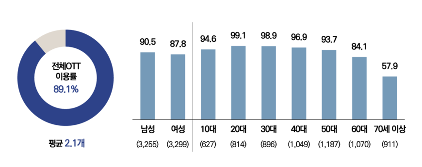 보고서에 따르면 최근 1년간 OTT를 이용한 경험이 있는 응답자는 89.1%였고, OTT 이용 개수는 평균 2.1개였다. OTT 이용률은 99.1%로 가장 높은 20대를 포함해 10대부터 40대까지 모두 90%를 넘었고, 50~60대도 80%를 훌쩍 넘었으며, 70세 이상에서도 57.9%로 2명 중 1명 이상이 OTT를 이용하는 것으로 나타났다.