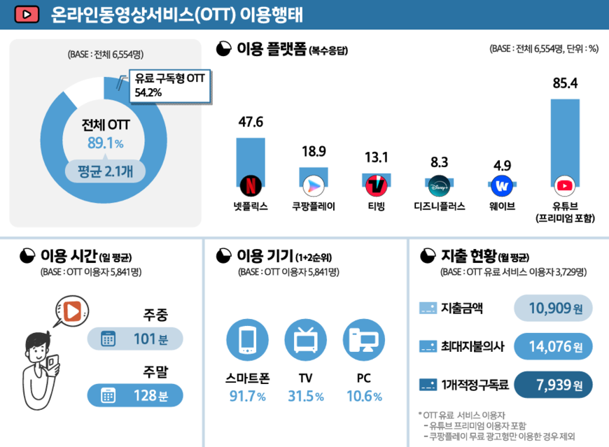 가장 많이 이용하는 OTT 플랫폼은 유튜브(프리미엄 포함)로 85.4%를 차지했다. 유료 구독형 OTT 서비스 중에선 넷플릭스(47.6%)를 가장 많이 이용하는 것으로 나타났다. 이어 쿠팡플레이(18.9%), 티빙(13.1%) 등 순이었다. OTT 이용 시간은 주중 평균 101분, 주말 평균 128분으로 1주일 평균 4시간 가까이 됐다.