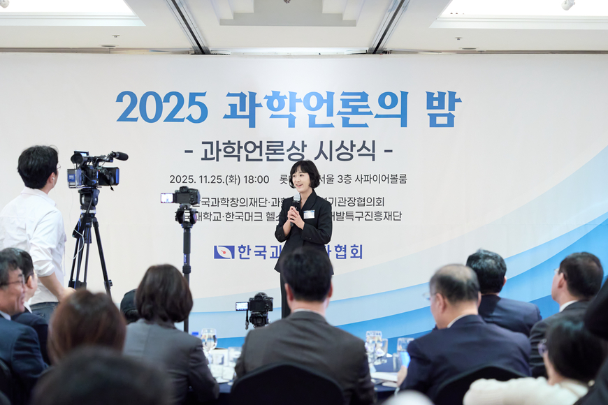 11월25일 서울 중구 소공동 롯데호텔 3층 사파이어볼룸에서 열린 ‘2025 과학언론상’ 시상식. 이름을 부르자 김윤미 MBC 기자가 양팔을 살짝 들어 객석에 인사한 뒤 환하게 웃으며 나비처럼 가볍게 연단에 올랐다. 그가 받은 상패에는 ‘대한민국과학기자상’이 찍혀 있었다.