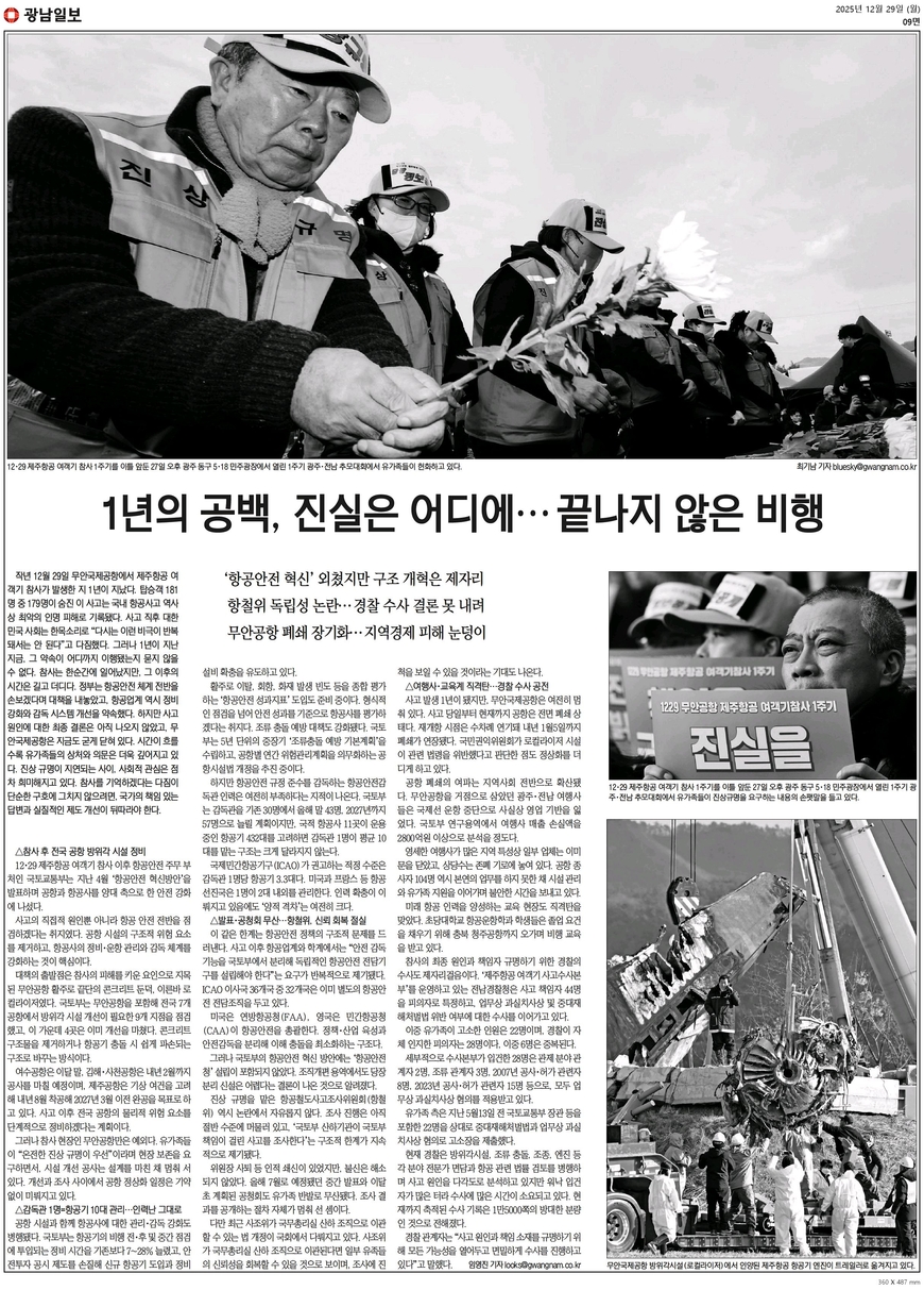 광남일보는 참사 이후 정부가 발표한 항공안전 혁신방안의 이행 현황을 점검했다. 국토교통부는 참사 이후 무안공항을 포함, 전국 7개 공항에서 방위각 시설 개선이 필요한 9개 지점을 선정했고 이 중 4곳은 개선을 마쳤다. 광남일보는 “하지만 항공안전감독관 인력 부족 문제는 여전하다”며 “항공안전청 독립 설립 역시 무산됐다. 국제민간항공기구 이사국 36개국 중 32개국은 이미 별도의 항공안전 전담조직을 두고 있지만, 국토부의 항공안전 혁신방안에는 항공안전청 설립이 포함되지 않았다”고 보도했다.