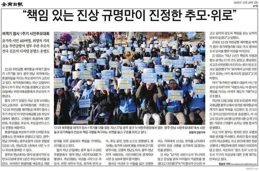 12·29 제주항공 참사가 발생한 지 1년이 지났다. 광주·전남 지역 언론사들은 이날 1주기를 맞아 추모대회 현장부터 정책 분석, 진상 규명 과정까지 다양한 각도로 참사를 되짚었다. 유가족들의 절규를 전하는 한편, 참사 현장에 투입됐던 소방관들의 고통을 조명하는 등 언론사들은 저마다의 방식으로 ‘끝나지 않은 비행’을 기록했다.