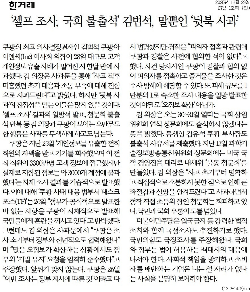 한겨레는 “앞뒤가 맞지 않는다. (중략) 사건 당사자인 쿠팡이 경찰과 협의 없이 피의자를 접촉하고 증거물을 조사한 것은 수사 방해에 해당할 수 있다. 또 피해 규모를 1만분의 1로 축소한 조사 내용을 일방 발표한 것이야말로 ‘오정보 확산’ 아닌가”라고 지적했다. 한겨레는 30, 31일 국회 상임위 연석 청문회에 출석하지 않겠다고 한 김 의장에 대해 “사과(는) 하면서 정작 직접 소통의 장인 청문회는 회피하고 있다. 국민과 국회 우롱이 도를 넘었다”고 비판했다.