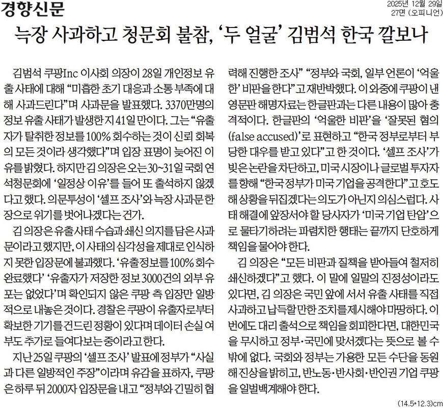 경향신문도 이날 <늑장 사과하고 청문회 불참, ‘두 얼굴’ 김범석 한국 깔보나> 사설을 통해 쿠팡 대응의 부적절함을 언급했다. 이 신문은 “김 의장은 유출 사태 수습과 쇄신 의지를 담은 사과문이라고 했지만, 이 사태의 심각성을 제대로 인식하지 못한 입장문에 불과했다”며 “이 와중에 쿠팡이 낸 영문판 해명자료는 한글판과는 다른 내용이 많아 충격적이다. 한글판의 ‘억울한 비판’을 ‘잘못된 혐의(falsely accused)’로 표현하고 ‘한국 정보로부터 부당한 대우를 받고 있다’고 한 것”이라고 적었다.