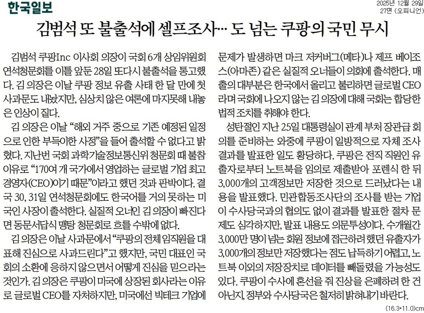 한국일보도 이날 <김범석 또 불출석에 셀프조사…도 넘는 쿠팡의 국민 무시>란 제목의 사설을 내놨다. 한국일보는 김 의장의 청문회 불출석에 대해 “결국 30, 31일 연석청문회에도 한국어를 거의 못하는 미국인 사장이 출석한다. 실질적 오너인 김 의장이 빠진다면 동문서답식 맹탕 청문회로 흐를 수밖에 없다”고 했다.