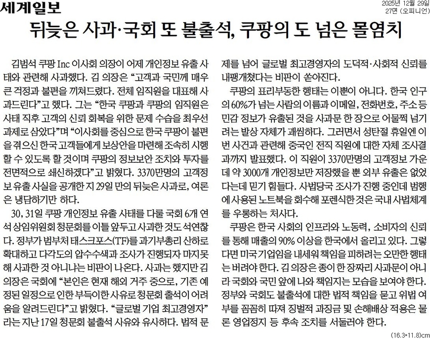 세계일보도 이날 사설 <뒤늦은 사과·국회 또 불출석, 쿠팡의 도 넘은 몰염치>를 통해 혹평을 내놨다. 세계일보는 일련의 쿠팡 대응에 대해 “3370만명의 고객 정보 유출 사실을 공개한 지 29일만의 뒤늦은 사과로, 여론은 냉담하기만 하다”, “정부가 범부처 태스크포스(TF)를 과기부총리 산하로 확대하고 다각도의 압수수색과 조사가 진행되자 마지못해 사과한 것 아니냐는 비판이 나온다”, “법적 문제를 넘어 글로벌 최고경영자의 도덕적·사회적 신뢰를 내팽개쳤다는 비판이 쏟아진다”고 적었다.