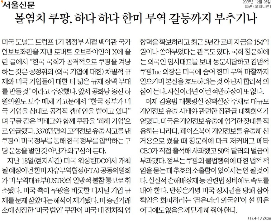 26일 한국일보의 <“한국 정부가 미국 기업 공격”…도 넘은 쿠팡 로비>, 서울신문의 <몰염치 쿠팡 하다 하다 한미 무역 갈등까지 부추기나> 사설 등도 같은 궤에 놓을 수 있다. 서울신문은 미국 공화당 중진 하원의원의 보수 매체 기고, 로버트 오브라이언의 발언 등을 언급, “쿠팡이 미국 정부를 통해 한국 정보를 압박하는 구명 운동을 벌인 것 아닌가 의구심이 든다”고 했다.