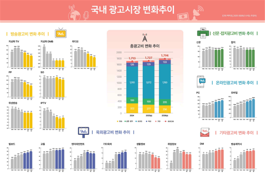 방송미디어통신위원회와 한국방송광고진흥공사가 8일 발표한 ‘2025년 방송통신광고비 조사’에 따르면 2024년 국내 방송통신광고비는 17조1263억원으로 전년 대비 3.5% 증가했다. 매체별로 보면 온라인 광고비가 10조 1011억원으로, 전체 광고비의 59%를 차지했고 방송 광고비는 3조 2191억원으로 18.8%, 신문·잡지 광고가 1조 9875억원으로 11.6%, 옥외 광고는 1조 2591억원으로 7.4% 비중으로 집계됐다.