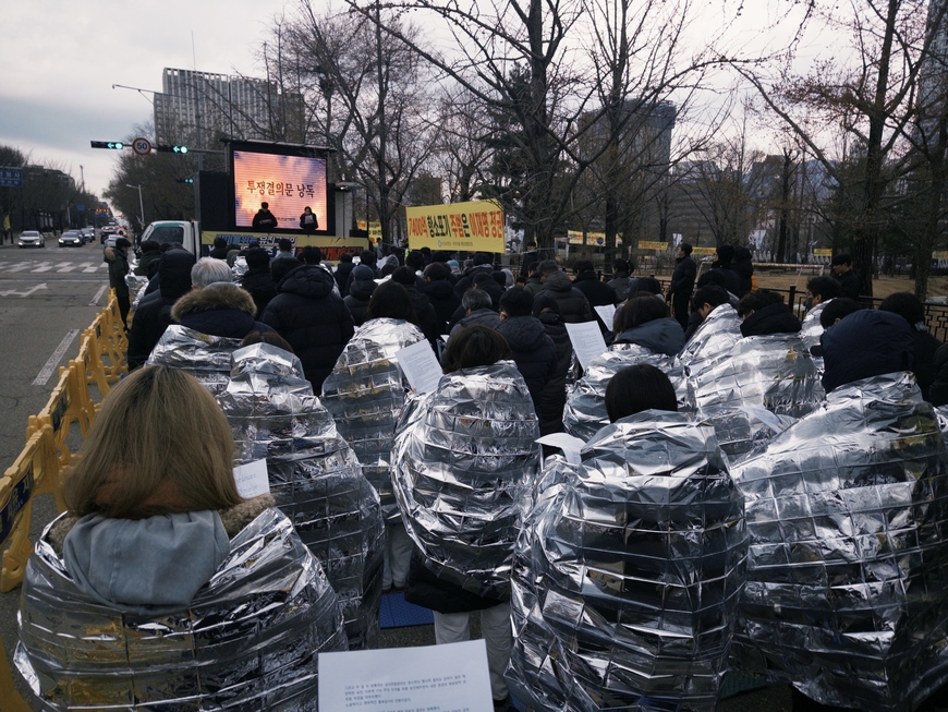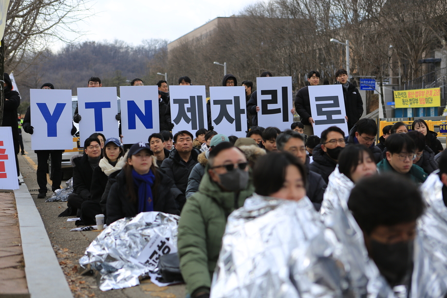쟁의 233일차를 맞은 전국언론노동조합 YTN지부가 사흘 간 전면 파업 돌입을 선언하며 9일 경기 과천 정부과천청사 정문 앞에서 결의대회(6차)를 열었다. 영하의 날씨 속에 모인 150여명 조합원들은 유진그룹의 YTN 최다액출자자 자격을 방미통위가 박탈해야 한다며 “내란결탁 유진퇴출“, “방미통위 응답하라“ 등의 구호를 외쳤다.