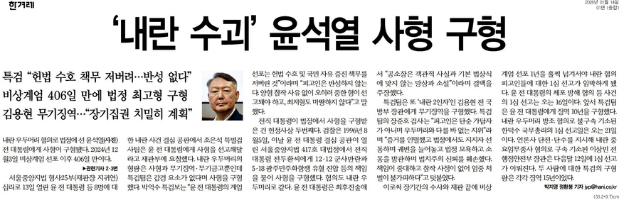 한겨레 <‘내란 수괴’ 윤석열 사형 구형>