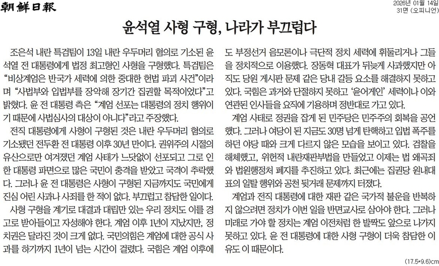 조선일보 <윤석열 사형 구형, 나라가 부끄럽다>