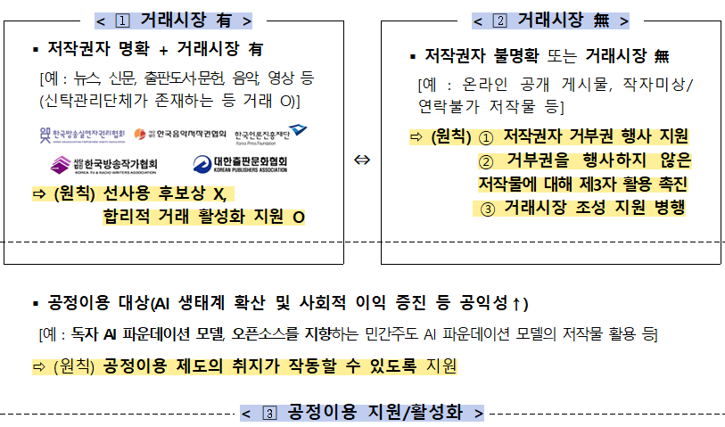 이에 위원회는 행동계획 내 저작물 과제 관련 기본 원칙을 제시하며 “뉴스나 신문, 방송, 음악·영상처럼 원 저작권자를 명확히 알 수 있고 이미 거래 시장이 형성된 분야에 대해선 ‘선 사용 후 보상’이 아니라 저작권자의 정당한 권리를 보장하며 해당 시장에서 합리적인 거래가 활성화될 수 있도록 지원한다”고 설명했다.