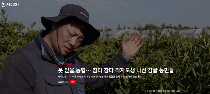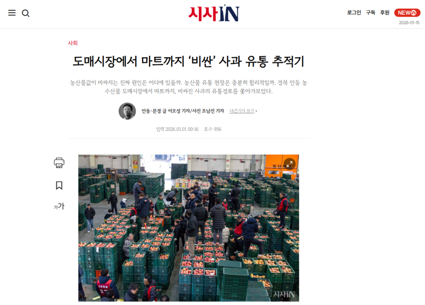 농산물값이 오르면 소비자는 “너무 비싸다”고 한숨을 쉰다. 그런데 정작 농민들은 “원가도 안 나온다”고 아우성이다. 대체 이런 문제는 왜 생기는 걸까. 산지 과일은 어떤 경로를 거쳐 소비자에게 향하는 걸까. 이 의문을 풀기 위해 시사IN, 주간경향, 한겨레21 세 주간지 기자들이 뭉쳤다. 이들은 지난해 말부터 올해 초까지 겨울 과일·과채의 유통경로를 따라가며 과제와 해법을 짚는 기사를 연이어 내보냈다. 이오성 시사IN 기자는 경북 안동 사과를, 이재덕 주간경향 기자는 경남 산청 딸기를, 김양진 한겨레21 기자는 제주 감귤을 맡아 각각 농산물 유통구조의 문제를 추적했다.