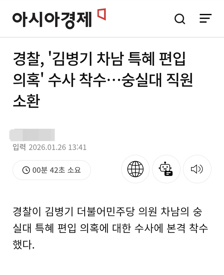 아시아경제는 지난 16일 삭제한 <경찰, ‘김병기 차남 특혜 편입 의혹’ 수사 착수…숭실대 직원 소환> 기사를 26일 원상 복구했다. 1월15일 저녁 송고된 이 기사는 서울경찰청 공공범죄수사대가 숭실대학교 교직원들을 참고인 신분으로 불러 김 의원 차남의 숭실대 편입학 과정 등을 조사했다는 내용이다. 아시아경제 노조는 16일 기사 삭제 사실을 인지하고 편집국장과 두 차례 면담하며 경위를 파악했다. 기사 삭제 전후로 해당 기사를 쓴 기자는 삭제 사실을 알지 못했다.