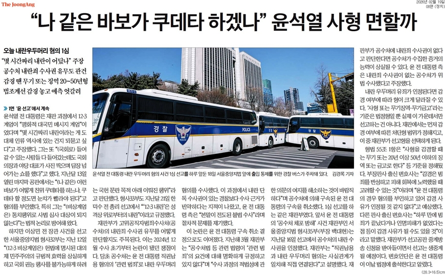동아일보는 4면 <‘尹계엄=내란’인정 여부가 핵심… 尹, 마지막까지 혐의 부인> 제하의 기사에서 “최대 쟁점은 12·3 비상계엄 선포가 내란으로 인정될지 여부”라며 “내란 중요임무 종사 혐의로 재판에 넘겨진 한덕수 전 국무총리, 이상민 전 행정안전부 장관의 경우 1심 법원이 죄를 인정하면서 각각 징역 23년, 징역 7년을 선고했다”고 설명했다.