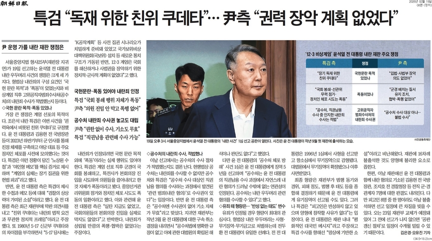 조선일보는 <특검 “독재 위한 친위 쿠데타”… 尹측 “권력 장악 계획 없었다”>란 제목의 기사에서 “쟁점은 크게 세 가지”라면서 “형법상 내란죄의 구성 요건인 ‘국헌 문란 목적’과 ‘폭동’이 있었는지와 비상계엄 직후 고위공직자범죄수사처(공수처)의 내란죄 수사가 적법했는지 등”이라고 했다.