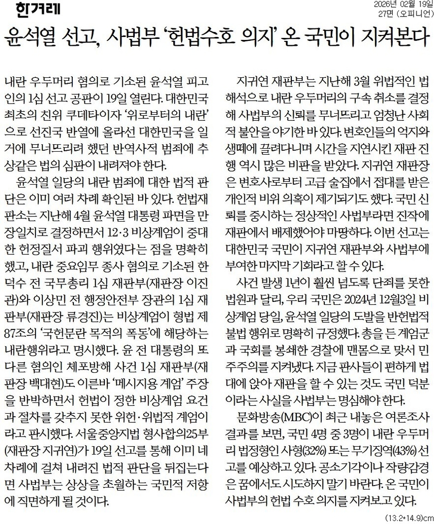 한겨레는 <윤석열 선고, 사법부 ‘헌법수호 의지’ 온 국민이 지켜본다> 제하의 사설에서 헌재의 탄핵심판을 비롯해 앞선 재판들에서 12·3 계엄이 “중대한 헌정질서 파괴 행위”였으며 ‘국헌문란 목적의 폭동’에 해당하는 내란 행위라고 명시한 점을 짚으며 “이미 네차례에 걸쳐 내려진 법적 판단을 뒤집는다면 사법부는 상상을 초월한 국민적 저항에 직면하게 될 것”이라고 밝혔다.