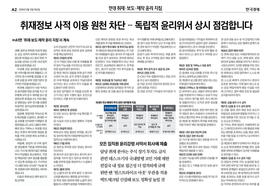 해당 지침에 따르면 신문제작부서 임직원은 6개월 이상 장기보유를 목적으로 하는 투자를 제외하고 모든 국내 상장·비상장사에 대한 단기 주식 거래가 금지된다. 관련해 보유 중인 주식은 빠른 시일 내 매각해야 한다. 또 1년에 두 차례 주식 거래 및 보유 내역도 회사에 보고해야 한다. 한국경제는 모든 임직원에게 윤리강령 서약서를 제출하도록 했다.