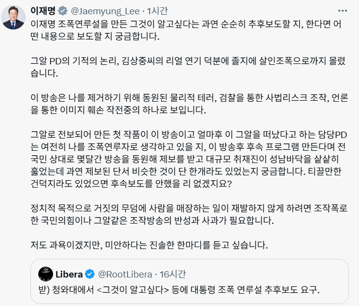 그러면서 “정치적 목적으로 거짓의 무덤에 사람을 매장하는 일이 재발하지 않게 하려면 조작 폭로한 국민의힘이나 그알 같은 조작방송의 반성과 사과가 필요하다”며 “저도 과욕이겠지만, 미안하다는 진솔한 한마디를 듣고 싶다”고 했다.