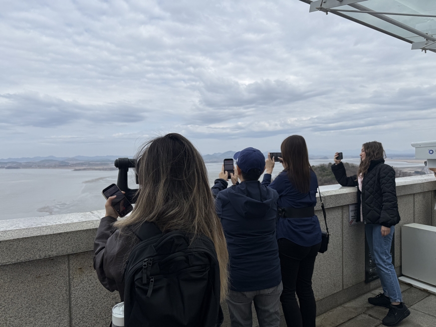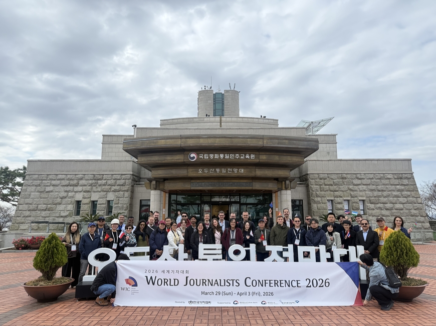 새벽녘까지 내리던 비가 그치고 나자 경기도 파주시 오두산 통일전망대 너머로 북한 땅이 선명하게 모습을 드러냈다. ‘2026 세계기자대회’에 참가한 세계 각국의 기자들은 망원경에 눈을 고정한 채 임진강 너머 풍경을 담아내느라 분주했다.