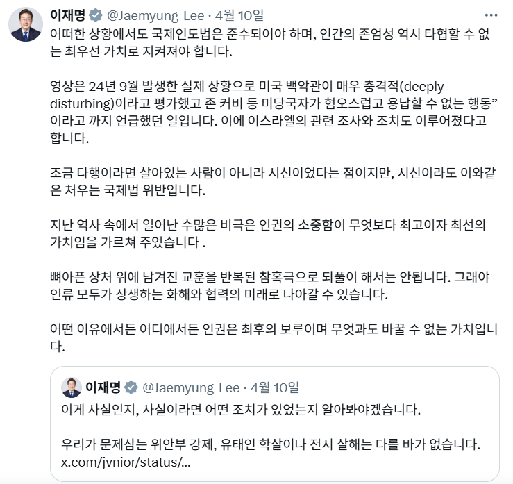 그러나 해당 영상은 2년 전 촬영된 것으로 기재된 설명과도 다르다는 지적이 제기됐고, 이 대통령은 약 4시간 뒤 다시 엑스에 글을 올려 “조금 다행이라면 살아있는 사람이 아니라 시신이었다는 점이지만, 시신이라도 이와 같은 처우는 국제법 위반”이라면서 “어떠한 상황에서도 국제인도법은 준수되어야 하며, 인간의 존엄성 역시 타협할 수 없는 최우선 가치로 지켜져야 한다”고 했다.