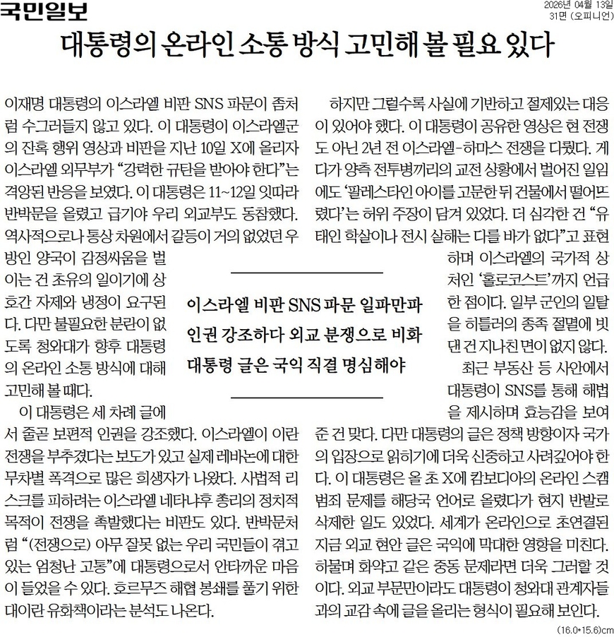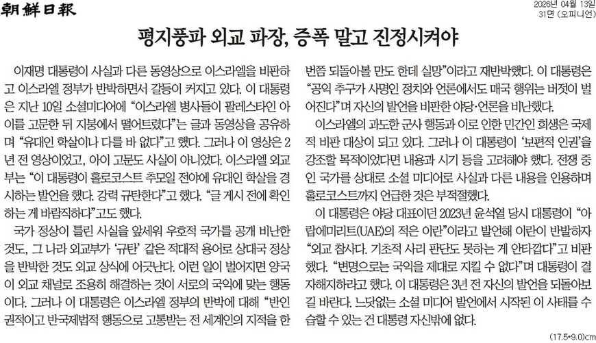 조선은 이어 “이스라엘의 과도한 군사 행동과 이로 인한 민간인 희생은 국제적 비판 대상이 되고 있다. 그러나 이 대통령이 ‘보편적 인권’을 강조할 목적이었다면 내용과 시기 등을 고려해야 했다”면서 “전쟁 중인 국가를 상대로 소셜 미디어로 사실과 다른 내용을 인용하며 홀로코스트까지 언급한 것은 부적절했다”고 지적했다. 그러면서 “느닷없는 소셜 미디어 발언에서 시작된 이 사태를 수습할 수 있는 건 대통령 자신밖에 없다”고 덧붙였다.