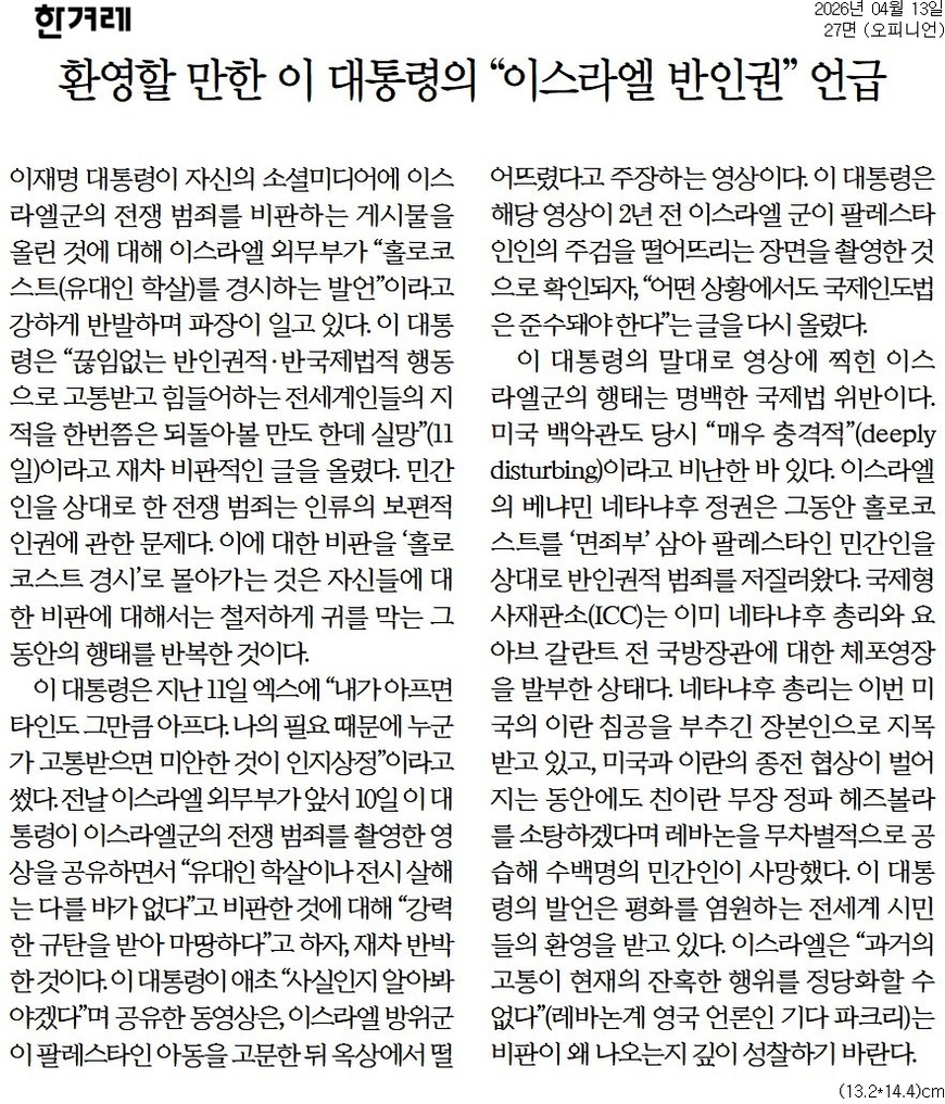 한겨레는 아예 이 대통령의 언급을 “환영”하고 나섰다. 한겨레는 <환영할 만한 이 대통령의 “이스라엘 반인권” 언급> 제하의 사설에서 “이 대통령의 발언은 평화를 염원하는 전세계 시민들의 환영을 받고 있다”며 이스라엘을 향해 “‘과거의 고통이 현재의 잔혹한 행위를 정당화할 수 없다’(레바논계 영국 언론인 기다 파크리)는 비판이 왜 나오는지 깊이 성찰하기 바란다”고 했다.