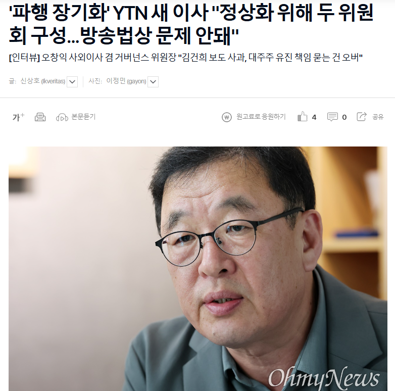 오마이뉴스가 공개한 일문일답에서 오 이사는 ‘정상화’라는 단어를 다섯 번 언급했다. 3월27일 주주총회에서 양상우 전 한겨레 사장 등과 함께 신임 이사로 선임돼 거버넌스위원회 위원장을 맡고 있는 그는 “유진그룹 부역자”들의 “YTN 경영권 찬탈”이라는 노조 비판을 반박하며 “YTN 정상화에 기여하겠다”는 의지를 피력했다. 사퇴 요구 또한 일축하며 “노조와 ‘YTN 정상화 어떻게 가능한가’ 이런 주제로 토론이라도 했으면 좋겠다”고도 했다.
