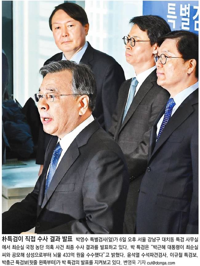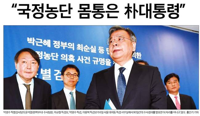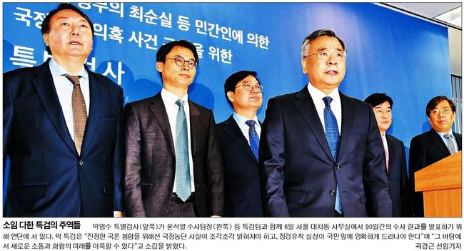 7일 경향신문, 국민일보, 동아일보, 서울신문, 한겨레, 한국일보는 박영수 특검 등 특검팀의 모습을 1면에 싣고 수사결과를 분석했다.