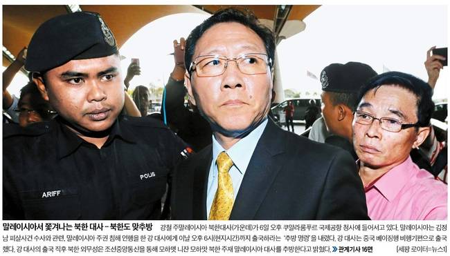 이날 세계일보와 중앙일보는 김정남 피살사건과 관련해 말레이시아 주권 침해 언행으로 추방 명령을 받은 강철 주말레이시아 북한 대사의 모습을 1면에 실었다.