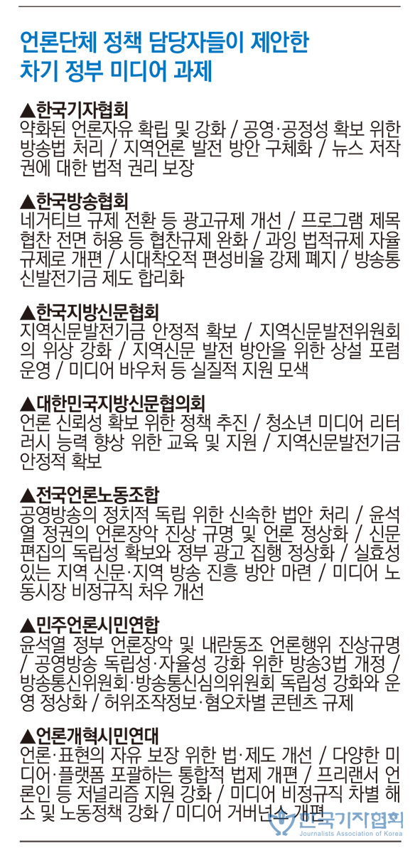 기자협회보는 3년 만에 치러지는 대선을 앞두고 한 번 더 산적해 있는 언론 과제를 한데 모았다. 한국기자협회를 포함, 한국방송협회, 한국지방신문협회, 대한민국지방신문협의회, 전국언론노동조합, 민주언론시민연합, 언론개혁시민연대 등 7개 언론 관련 단체에 요청해 시급히 해결해야 할 언론 과제를 받았다. 이들은 차기 정부가 낡은 규제를 해소하고 언론의 정치적 독립을 보장하며 실효성 있는 지원을 해야 한다고 강조했다. 이들이 요구하는 언론 과제를 2회에 걸쳐 정리한다. <편집자 주>