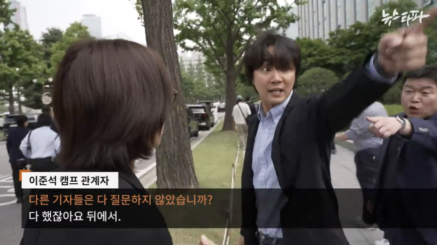 대선을 일주일 앞둔 5월27일 이명선 뉴스타파 기자를 밀치며 윽박지른 이 전 후보 측은 기자의 태도를 문제 삼았다. 기자회견을 끝내고 이동하는데도 따라와 취재 규칙을 어겼고 답을 거부한 질문을 반복해 잘못했다는 것이다. 이 전 후보 측 조영환 보좌관은 “상대가 싫다고 하지 않았느냐, 정치인은 무조건 답해야 하느냐”며 뉴스타파의 사과 요구도 거절했다.