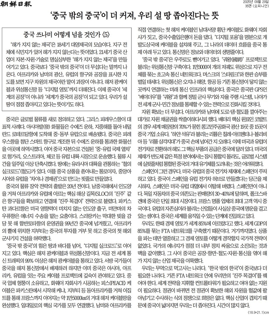 조선일보는 ‘중국 쓰나미 어떻게 넘을 것인가’ 제하의 시리즈 사설을 싣고 있다. 29일까지 5회차가 나왔고, 앞으로 더 나올 예정이다. 조선일보는 앞서 1회차 사설을 내며 “트럼프 관세 폭탄과 보호무역주의, 신냉전 부활로 한국의 자강(自强)이 절실해지고 있다. 자강의 핵심은 글로벌 강자 한국 산업이다. 그러나 석유화학 사태에서 보듯 우리 핵심 산업은 모두 쓰나미 앞에 서 있다. 쓰나미 진앙은 중국이다. 이 위기를 어떻게 넘어 자강으로 나갈 수 있을까”라고 기획 의도를 밝혔다.