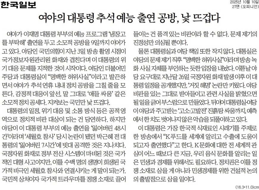 한국일보는 10일자 사설 <‘여야의 대통령 추석 예능 출연 공방, 낯 뜨겁다’>에서 “여야가 이재명 대통령 부부의 예능 프로그램 ‘냉장고를 부탁해’ 출연을 두고 소모적 공방을 9일까지 이어가고 있다”며 “감정적 대응이 앞선, 말 그대로 ‘애들 싸움’ 같은 소모적 정치 공세다. 지켜보는 국민만 낯 뜨겁다”고 질타했다.