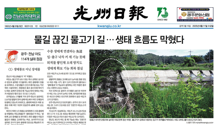 10월31일 열린 ‘2025 지역신문 컨퍼런스’에서 대상을 받은 김진아 광주일보 기자는 “‘큰물을 바꾸려면 결국 자잘한 물고기들이 있는 작은 물부터 바꿔야 한다’는 한 주민의 말이 오래 기억에 남는다”고 했다. 김 기자는 컨퍼런스에서 물고기들이 하천 구조물을 넘어 상·하류를 오갈 수 있도록 설치한 ‘어도(魚道)’가 방치돼 하천 생태계를 단절시키고 있다는 내용의 ‘물길 끊긴 어도, 생태계도 끊겼다’에 대해 발표했다.