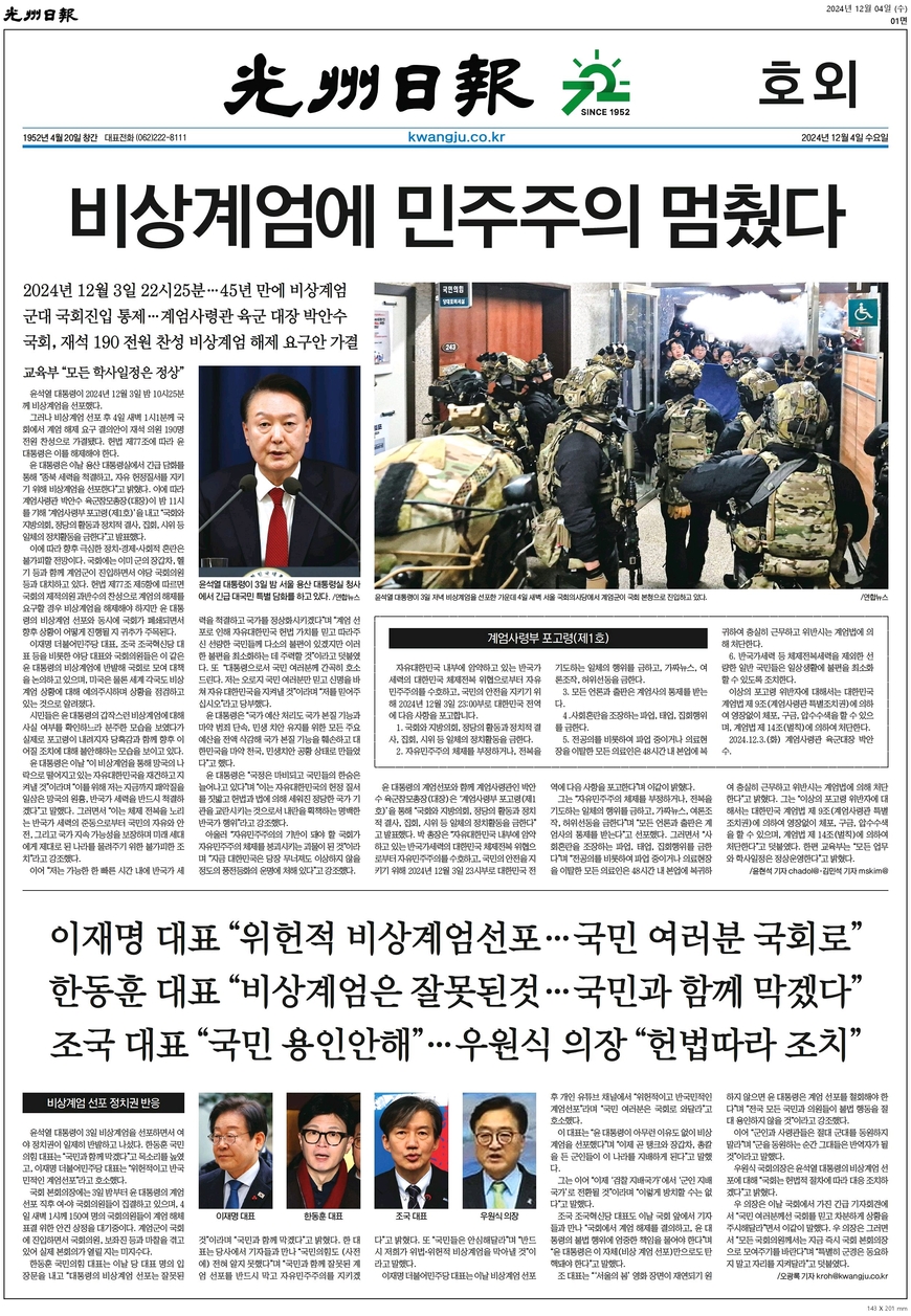 광주일보는 당시 밤 11시부터 제작에 들어가 자정 무렵 1차 마감을 끝냈다. 이후 국회 표결 결과를 기다리며 제목 등을 수정, 오전 12시30분 즈음 호외 1만5000부를 찍어냈다. 무등일보도 비상계엄 발령과 국회의 계엄 해제 요구안 가결 소식을 담아 2~3시간 만에 호외를 제작했다. 호외 발행은 1988년 무등일보 창간 이후 처음 있는 일이었다. 류성훈 국장은 “제작한 호외는 기자들이 직접 들고 가 광주공항, 광주고속버스터미널 등 사람들이 많이 모이는 곳에 배치했다”며 “무등일보는 그 후 2번의 호외를 더 발행했다. 역사의 기록을 남겨야 한다는 사명감이 컸던 것 같다”고 말했다.