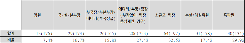 한편 에디터/부장/팀장, 논설/해설위원, 특파원 분야에서도 여성 기자 수가 두루 증가했다. 특히 여성 에디터/부장/팀장 수는 206명으로 사상 처음 200명을 넘었다. 지난해와 비교하면 49명이 늘었고, 전체 에디터/부장/팀장(753명)에서 여성이 차지하는 비율도 27.4%로 갈수록 높아지는 모습을 보였다.