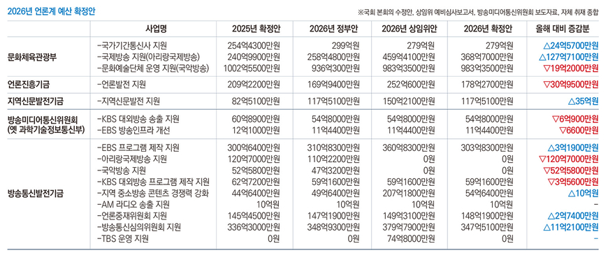 2026년도 예산안이 9일 국무회의를 통과한 가운데 언론계 예산이 올해보다 약 50억원 증액됐다. 윤석열 정부 들어 큰 폭으로 삭감된 예산이 일부 복원된 데 따른 것이다. 다만 이번 확정안이 국회 상임위안은 물론 정부안보다도 후퇴하면서 언론계 일각에선 비판의 목소리가 나오고 있다. 특히 상임위에서 편성한 운영 지원 예산이 전액 삭감된 TBS, 150억원가량의 예산이 증발된 지역 중소방송에선 추후 추가경정예산 편성 등을 통해 예산을 복구해야 한다는 요구가 잇따르고 있다.