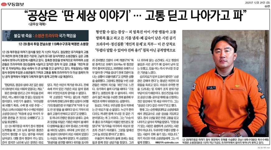 12·29 제주항공 참사가 발생한 지 1년이 지났다. 광주·전남 지역 언론사들은 이날 1주기를 맞아 추모대회 현장부터 정책 분석, 진상 규명 과정까지 다양한 각도로 참사를 되짚었다. 유가족들의 절규를 전하는 한편, 참사 현장에 투입됐던 소방관들의 고통을 조명하는 등 언론사들은 저마다의 방식으로 ‘끝나지 않은 비행’을 기록했다.