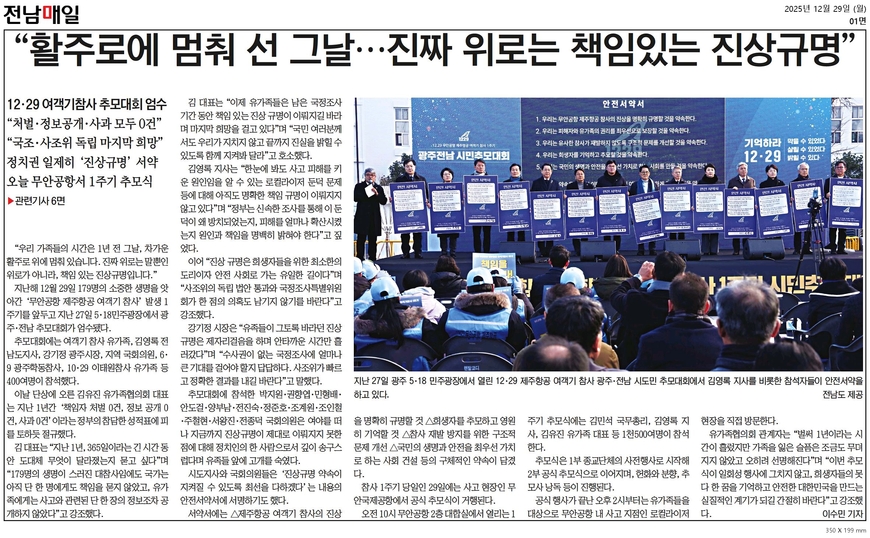 남도일보와 전남매일은 27일 광주 5·18민주광장에서 열린 추모대회 현장을 상세히 전했다. 남도일보는 제주항공 참사로 아내와 두 아들을 잃은 김영헌씨의 편지 낭독을 상세히 보도하며 “김 씨는 사고 소식을 처음 들었던 순간부터 무안공항에서의 신원 확인, 장례 이후 반복되는 꿈 이야기까지 담담히 풀어냈다. 편지가 끝나자 광장 곳곳에서 훔치는 울음이 이어졌고, 일부 시민은 고개를 들지 못한 채 눈물을 닦았다”고 전했다.
