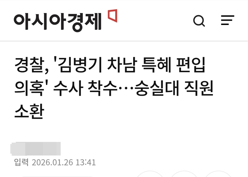 아시아경제는 지난 15일 저녁 출고된 <경찰, ‘김병기 차남 특혜 편입 의혹’ 수사 착수…숭실대 직원 소환> 기사를 이튿날 오후 삭제했다. 경찰이 숭실대학교 교직원들을 참고인 신분으로 불러 김병기 무소속 의원(전 더불어민주당 원내대표) 차남의 숭실대 편입학 과정 등을 조사했다는 내용이다. 삭제된 기사는 기자들 반발에 26일 원상 복구됐다.
