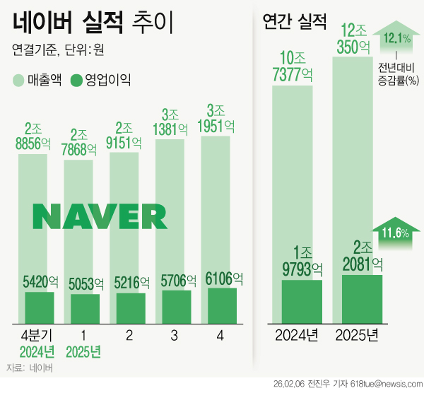 네이버가 6일 2025년 4분기 및 연간 실적을 공개하며 배포한 보도자료에서 인용한 최수연 네이버 대표의 말이다. 두 문장짜리 이 인용문에는 ‘AI’란 단어가 다섯 번 등장한다. 인공지능(AI)이 네이버를 성장시켰고, 앞으로 더 성장시킬 것이란 기대감이 읽힌다. 실제 네이버는 지난해 AI를 본격적으로 수익 사업에 접목함으로써 사상 첫 연 매출 12조원 시대를 열었다.
