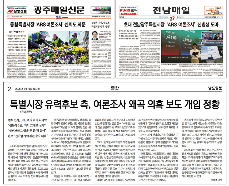남도일보의 언론중재 신청 배경엔 몇몇 신문사의 3월5일자 보도가 있다. 이날 광주매일과 전남매일은 1면에 <통합특별시장 ‘ARS 여론조사’ 신뢰도 의문>, <초대 전남광주특별시장 ‘ARS 여론조사’ 신빙성 도마>를 각각 실었다. 무선 전화 자동 응답(ARS) 방식의 여론조사가 여론을 왜곡할 우려가 있다는 취지의 기사로, 구체적 사례로 2월에 두 차례 진행된 전남광주 통합단체장 적합도 여론조사를 문제 삼았다. 전남 응답자가 광주보다 지나치게 많고, 특정 후보의 선호도가 급상승했다며 여론조사의 신뢰성에 의문을 제기했다. 광주일보 보도는 여론조사 신뢰성 의심 사례로 광양시장, 신안군수 후보 적합도 조사와 함께 전남 응답자 비율이 높게 나타난 2월 두 차례 여론조사를 언급했다.