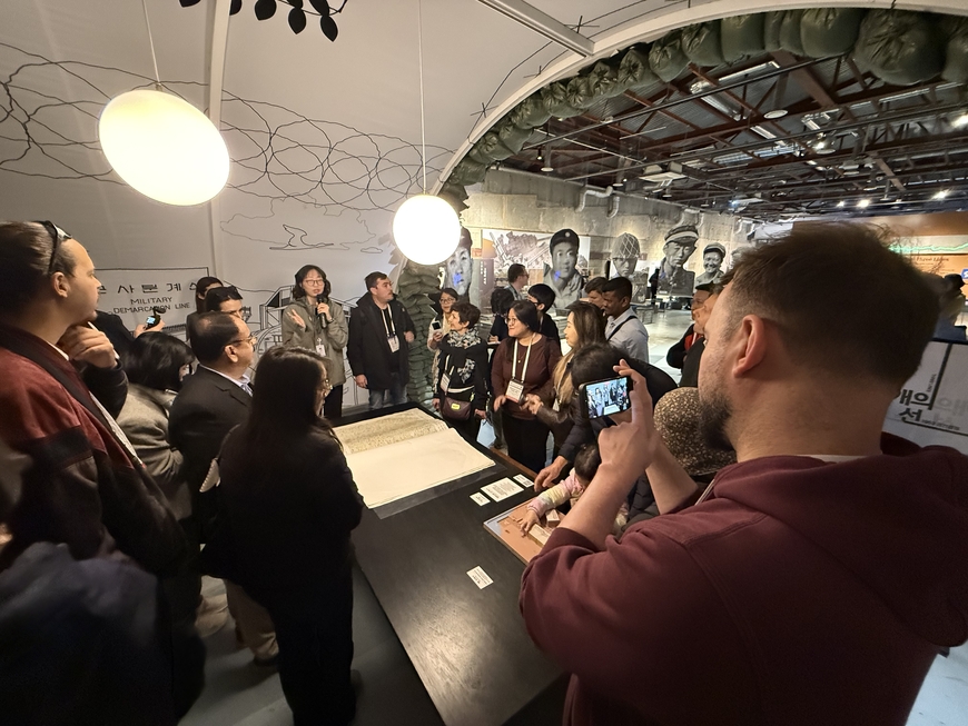 특히 기자들은 옛 미군 볼링장을 리모델링한 ‘갤러리 그리브스’ 내부를 구석구석 살폈다. 전시된 정전협정서 사본 앞에서 가이드의 설명을 경청하며 연신 카메라 셔터를 누르거나 휴대전화로 현장을 기록하기도 했다. 카메라를 바삐 움직이며 취재에 열의를 보인 체코 CNN 프리마뉴스의 야쿱 리하 기자는 “세계기자대회가 끝난 뒤 일주일간 더 머물며 탈북민과 이야기를 나눠볼 계획”이라고 했다. 그는 “오늘 일정과 탈북민 인터뷰를 바탕으로 한국에 관한 기사를 쓰려고 한다. 모든 자료를 확보해 가장 강렬한 주제가 무엇인지 판단해 최종적으로 기사 주제를 결정할 것”이라며 “현장을 보여줄 수 있는 영상 자료가 필요할 수 있겠다고 생각해 영상도 함께 촬영하고 있다”고 설명했다.