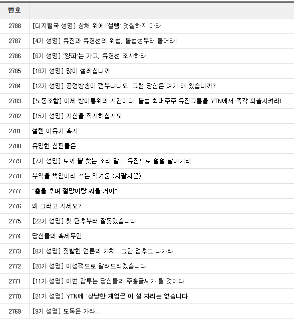 3월30일부터 1일 오후 현재까지 YTN 사내 게시판엔 YTN 이사회, 유진그룹에 대한 비판 성명·글이 수십 개 올라갔고, 계속 추가되는 중이다. 전국언론노동조합 YTN지부와 YTN 기자협회 등 단체 성명 2건을 비롯해 4·5·6·7·8·9·11·12·14·15·18·19·20·21·22기 기수 성명 15건, 개인 게시글 11건이 게재됐고, 디지털국 전·현직 구성원 43명도 공동 성명을 냈다.