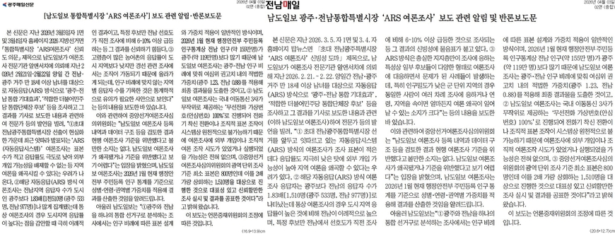 광주전남 지역 일간지 남도일보가 실시한 더불어민주당 전남광주 통합단체장 후보 여론조사에 대해 신뢰성 의문을 제기한 광주매일신문과 전남매일이 알림 및 반론보도를 냈다. 두 신문은 3일자 2면 우측 아래쪽에 3단 크기로 <남도일보 통합특별시장 ‘ARS 여론조사’ 보도 관련 알림·반론보도문>이라는 제목의 기사를 실었다. 이 보도는 홈페이지에도 실렸다.