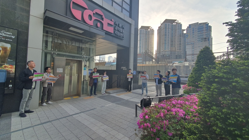 전국언론노동조합 YTN지부는 16일 오후 서울 용산구 서울시공익활동지원센터 앞에서 오창익 YTN 사외이사(현 인권연대 사무국장)의 사퇴를 촉구하는 피케팅을 진행했다. 오 이사에 대한 규탄 성명서를 시민들에게 배포하기도 했다. 이날 인권연대가 주최한 행사 장소 외부에 모인 이들은 “‘인권 운동가’를 자임하며 평생 정의와 인권을 외쳐온 오창익 인권연대 사무국장의 최근 행태는 가히 충격적”이라며 “우리가 알던 인권 운동가는 이미 자본의 논리에 매몰된 ‘유진의 입’이 되어버렸다”고 개탄했다.