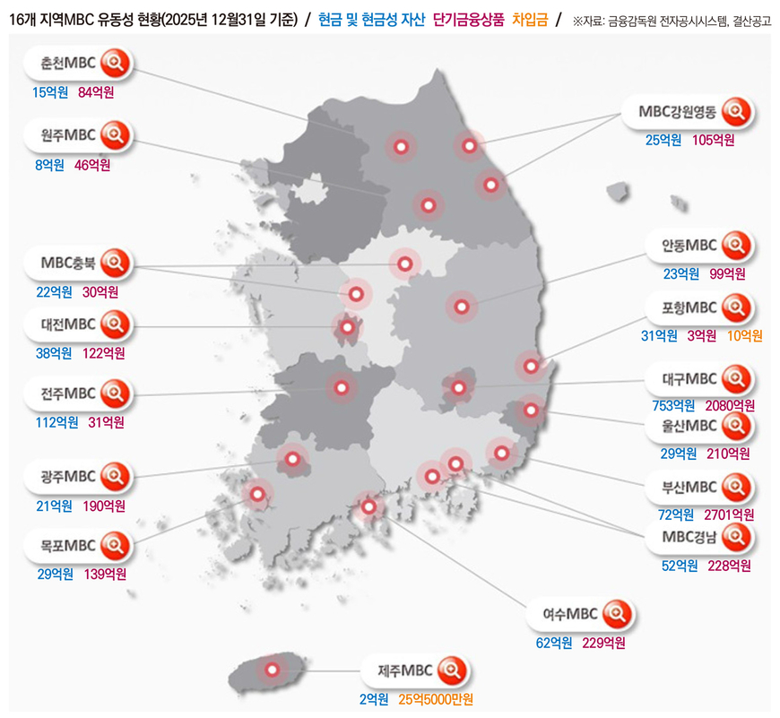 최근 3년(2023년~2025년)간 지역MBC 평균 영업손익을 따져보면 16곳 모두 마이너스였다. 영업적자액이 3년 평균 적게는 9000만원(목포MBC)에서 많게는 113억원(부산MBC)에 달한다. 매년 수십억씩 적자가 불어나 유보금으로 필요한 비용을 썼지만, 유보금마저 점점 고갈되어 가고 있다. 최근엔 임금피크제 소송에 패소하면서 대규모 추가 비용이 발생했다. 지난해 말 원주MBC의 현금 및 현금성 자산은 8억원, 단기 금융상품은 46억원이다. MBC충북도 현금 및 현금성 자산과 단기 금융상품을 합한 유동성이 52억원에 불과하다. 현금성 자산은 보통예금, 단기 금융상품은 정기예금, 채권, CD(양도성예금증서) 등을 말한다.