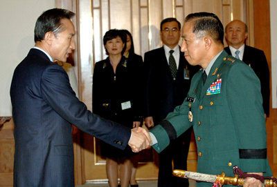 | ▲ 이명박 대통령이 27일 오후 청와대에서 김태영 합참의장의 보직신고를 받은 후 악수를 나누고 있다. (=뉴시스) | ||